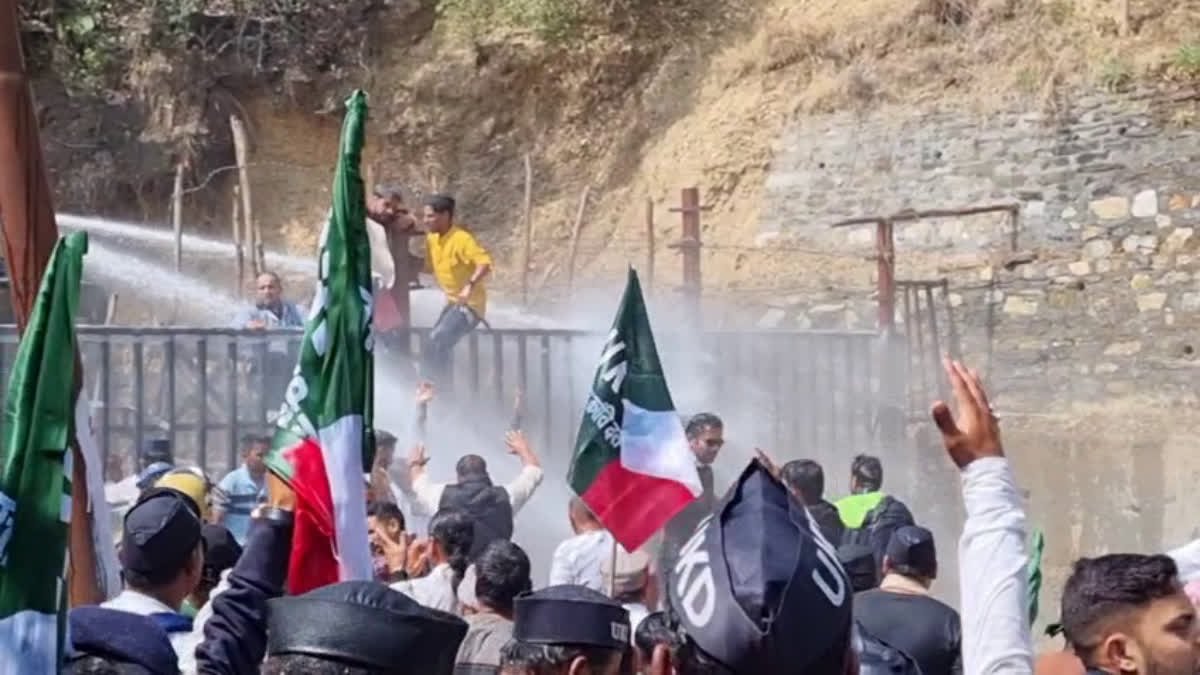 गैरसैंण। भराड़ीसैंण विधानसभा में आयोजित बजट सत्र के बीच विधानसभा के बाहर उत्तराखण्ड क्रांति दल ने प्रदेश के कई ज्वलंत मुद्दों को लेकर उग्र प्रदर्शन किया। विधानसभा की ओर बढ रहे यूकेडी कार्यकर्ताओं को पुलिस ने रोकने का प्रयास किया। इस दौरान प्रदर्शनकारियों और पुलिस के बीच जमकर धक्का मुक्की भी हुई। आखिर में पुलिस ने प्रदर्शनकारियों को रोकने के लिए वाटर कैनन का भी प्रयोग करना पड़ा।