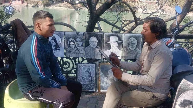 ऋषिकेश। योगनगरी ऋषिकेश के गंगा तट पर इन दिनों एक कलाकार अपनी अनोखी चित्रकला से पर्यटकों का दिल जीत रहा है। गंगा किनारे बैठकर लोगों के स्केच बनाने वाले इस कलाकार का हुनर देखते ही बनता है। उत्तर प्रदेश के अमरोहा जिले से आए 52 वर्षीय विमल मात्र 14 से 15 मिनट में किसी भी व्यक्ति का जीवंत स्केच तैयार कर देते हैं, जिसे देखकर सैलानी मंत्रमुग्ध हो जाते हैं।